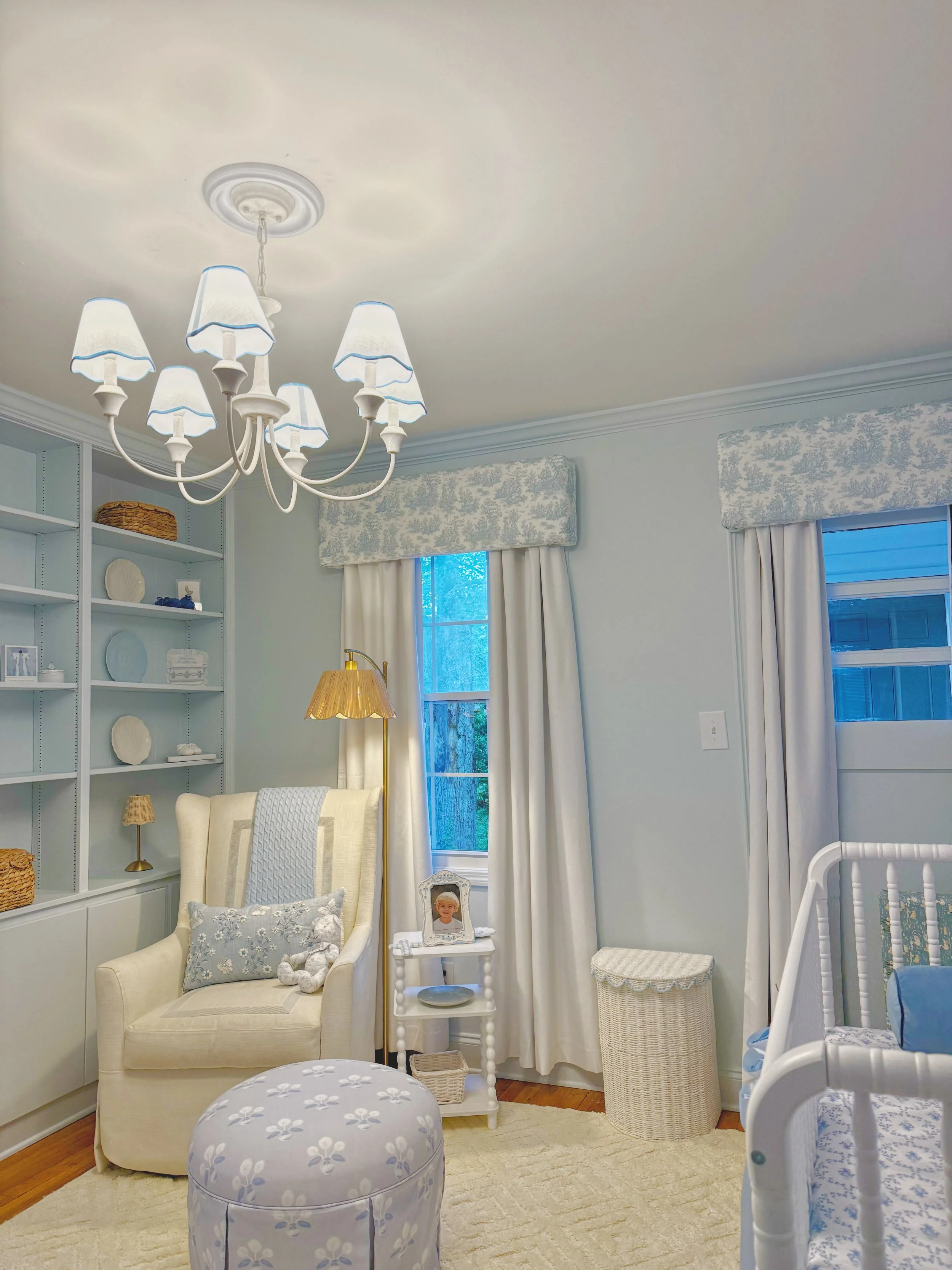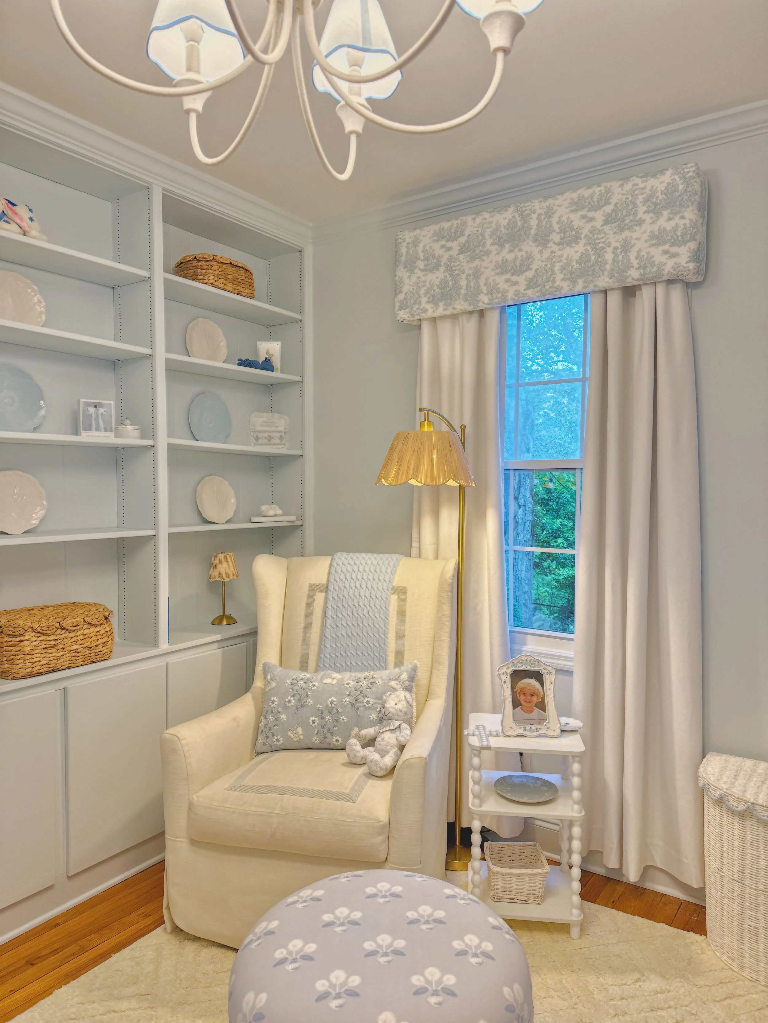 This nursery glider is custom from Lee Industries with Schumacher trim but I found it on my friend’s Instagram closet page and bought it for a FRACTION of the price! I love finding lovely second hand items.